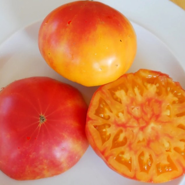 This low acidic Heirloom tomato produces very large, red and yellow striped fruit