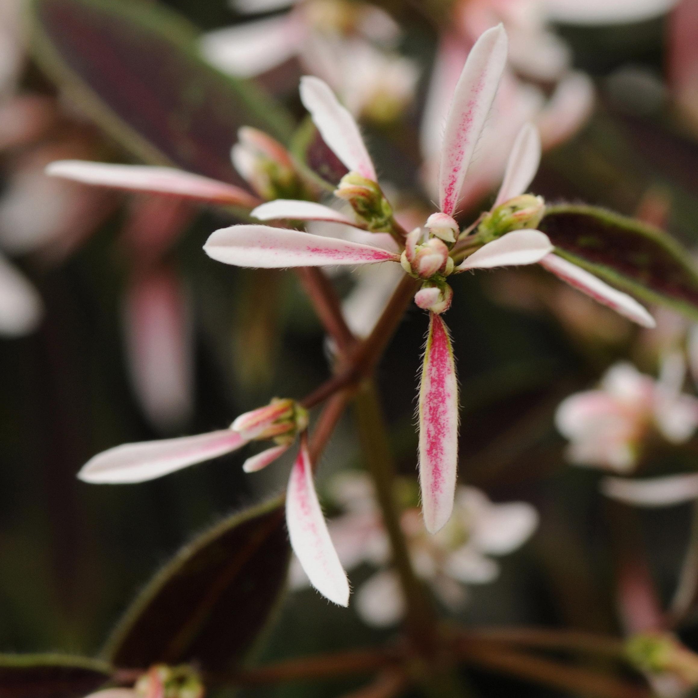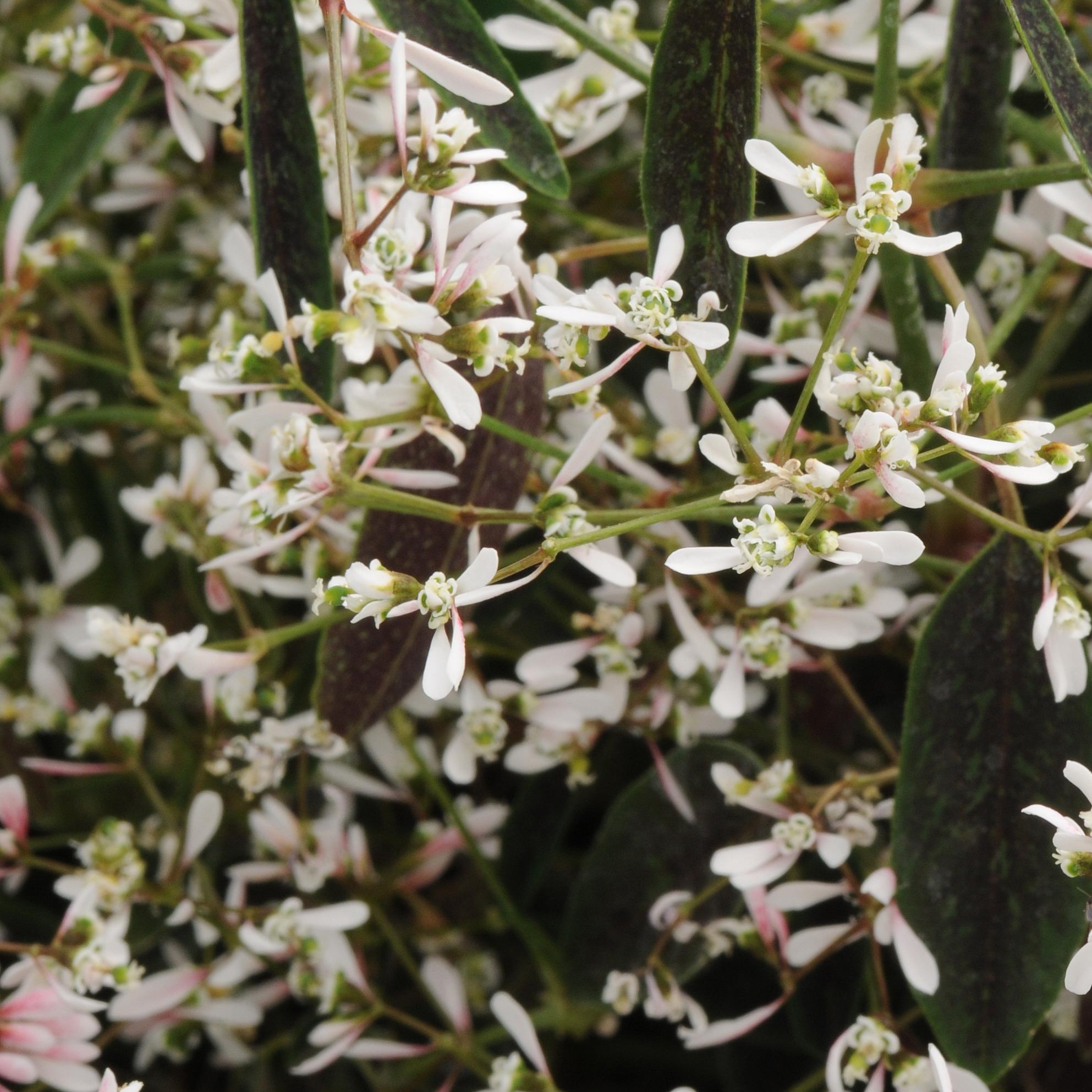 Airy, self cleaning white flowers that fade to a blush pink on distinct dark green leaves with a hint of red. This beautiful Euphorbia is great mounding in containers both inside and out. It resembles floral Baby's Breath but are Euphorbia are more durable and both heat and drought tolerant.